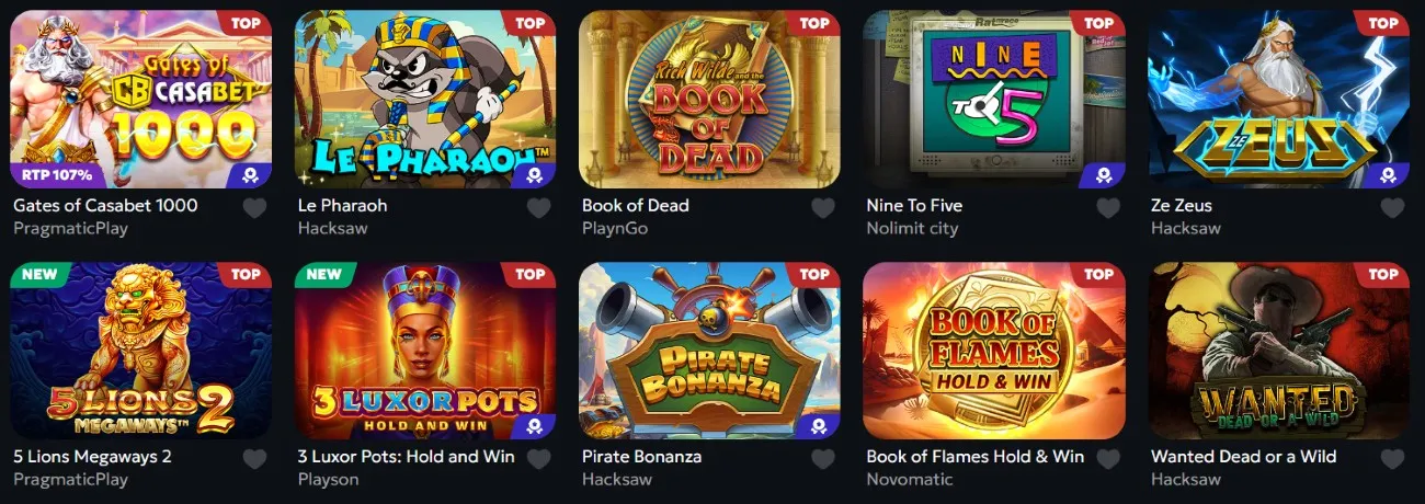 Παιχνίδια με τροχούς και γραμμές πληρωμής, ανάμεσα στους οποίους είναι δημοφιλείς επιλογές όπως οι Gates of Casabet 1000, Le Pharaoh, Book of Dead, Nine To Five, Ze Zeus.