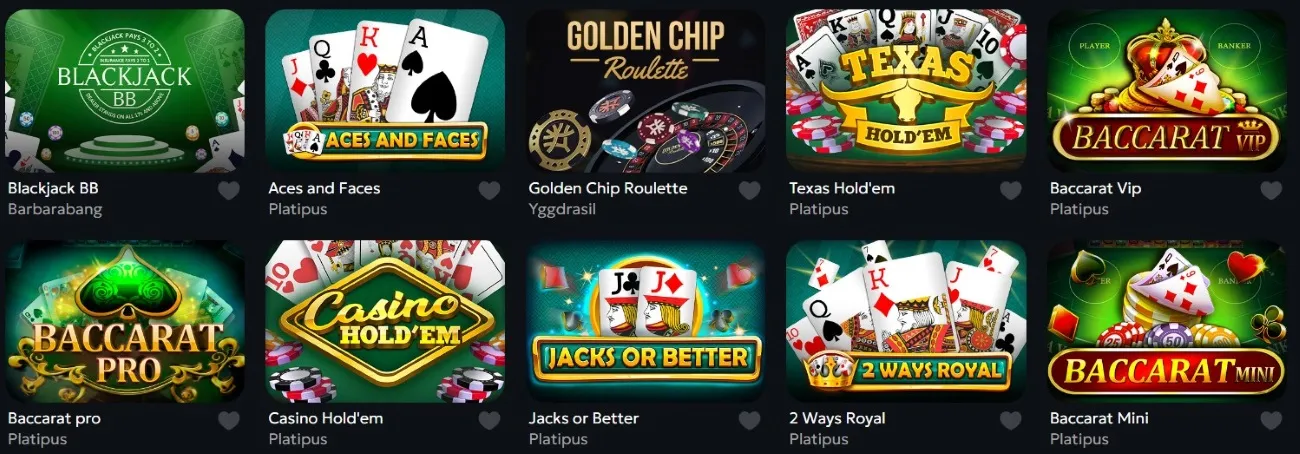 Ανάμεσα στα παιχνίδια καρτών, οι παίκτες από την Ελλάδα προτιμούν εκδόσεις του μπλακτζακ, πόκερ και μπακαρά. Για να κερδίσετε απαιτούνται γνώσεις κανόνων και δεξιότητες παιχνιδιού, όχι μόνο τύχη.